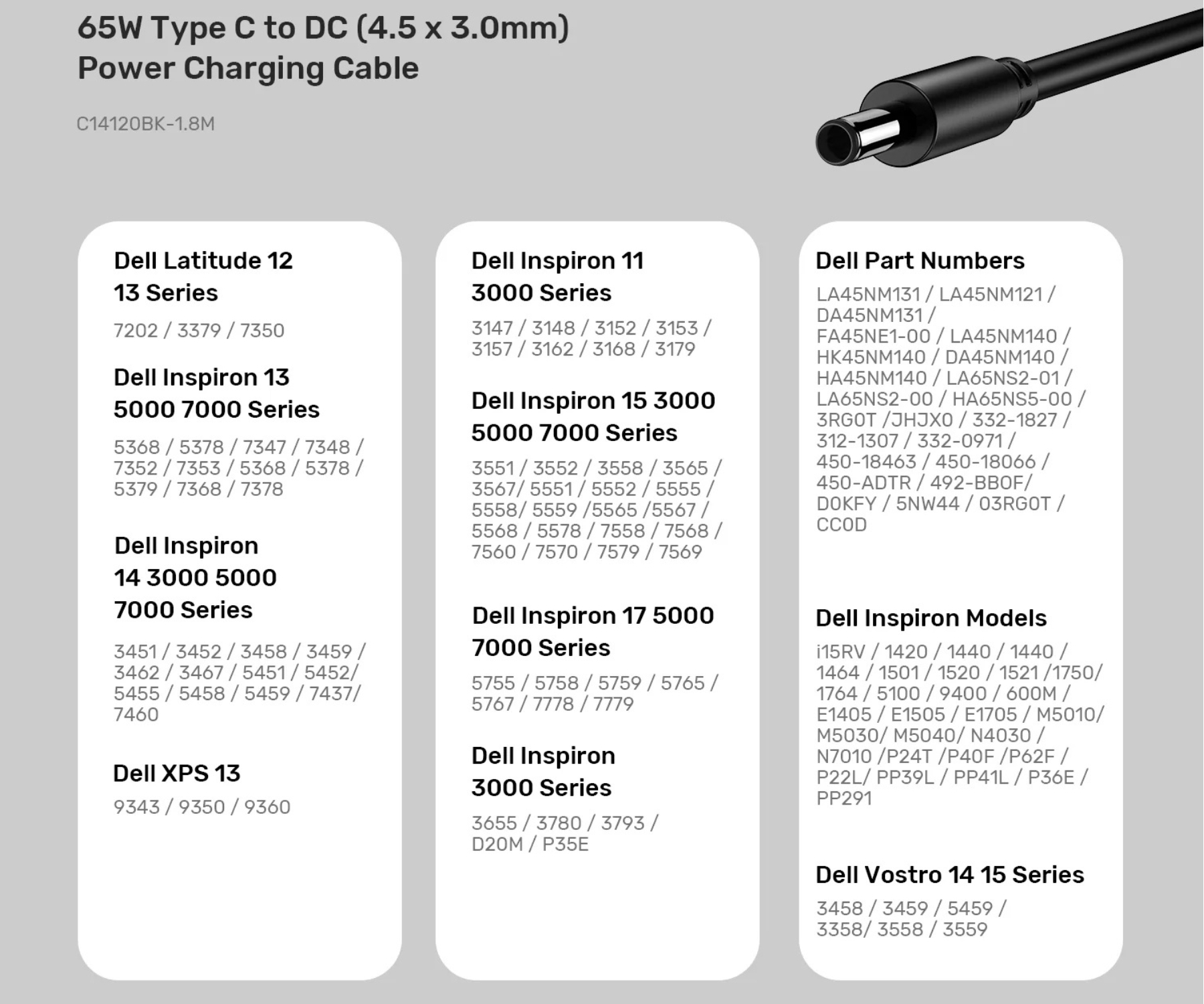 Kabel C14120BK-1.8M USB-C do DC 4.5 x 3.0 mm został zaprojektowany do ładowania laptopów Dell i obsługuje zasilanie USB-C PD do 65W (20V / 3.25A), dzięki czemu stanowi wygodną alternatywę dla klasycznego zasilacza. Wbudowany chip odpowiada za stabilne ładowanie, a przewód o długości 1.8 m wykonano z PVC i miedzi, co przekłada się na trwałość oraz wygodę codziennego użytkowania.