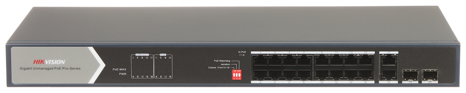 | Porty LAN: | 16 x RJ45 10/100/1000 Base-TX ( 4 x Hi-PoE (802.3af/at/bt) + 12 x PoE (802.3af/at) ), 2 x RJ45 10/100/1000 Base-TX - Uplink, 2 x port SFP 1000 Base-X - Uplink |